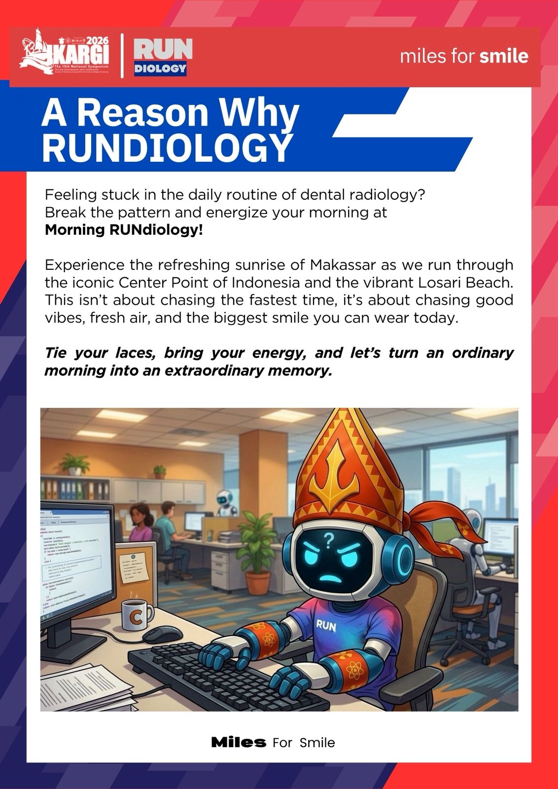 Feeling stuck in the daily routine of dental radiology? Break the pattern and energize your morning at Morning RUNdiology! Experience the refreshing sunrise of Makassar as we run through the iconic Center Point of Indonesia and the vibrant Losari Beach. This isn’t about chasing the fastest time, it’s about chasing good vibes, fresh air, and the biggest smile you can wear today. Tie your laces, bring your energy, and let’s turn an ordinary morning into an extraordinary memory.